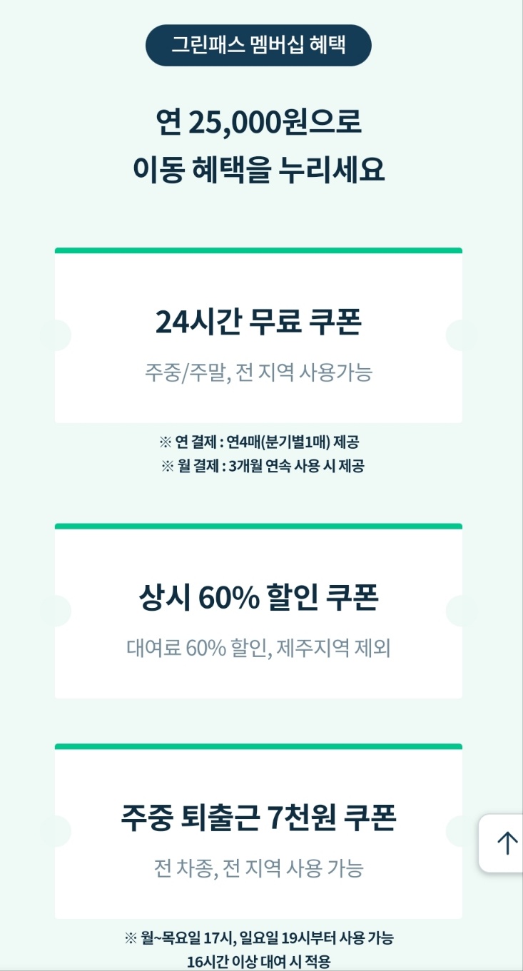그린카는 쏘카의 패스트포트 처럼 그린패스멤버십이 있습니다. 쏘카보다 저렴한 25000원 때의 가입이 가능하십니다.