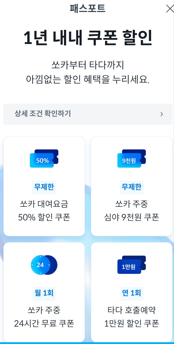 쏘카는 패스포트 제도가 있습니다 연 29900원 을 결제하고 쏘카대여 요금 50% 할인쿠폰, 주중 24시간 무료쿠폰등